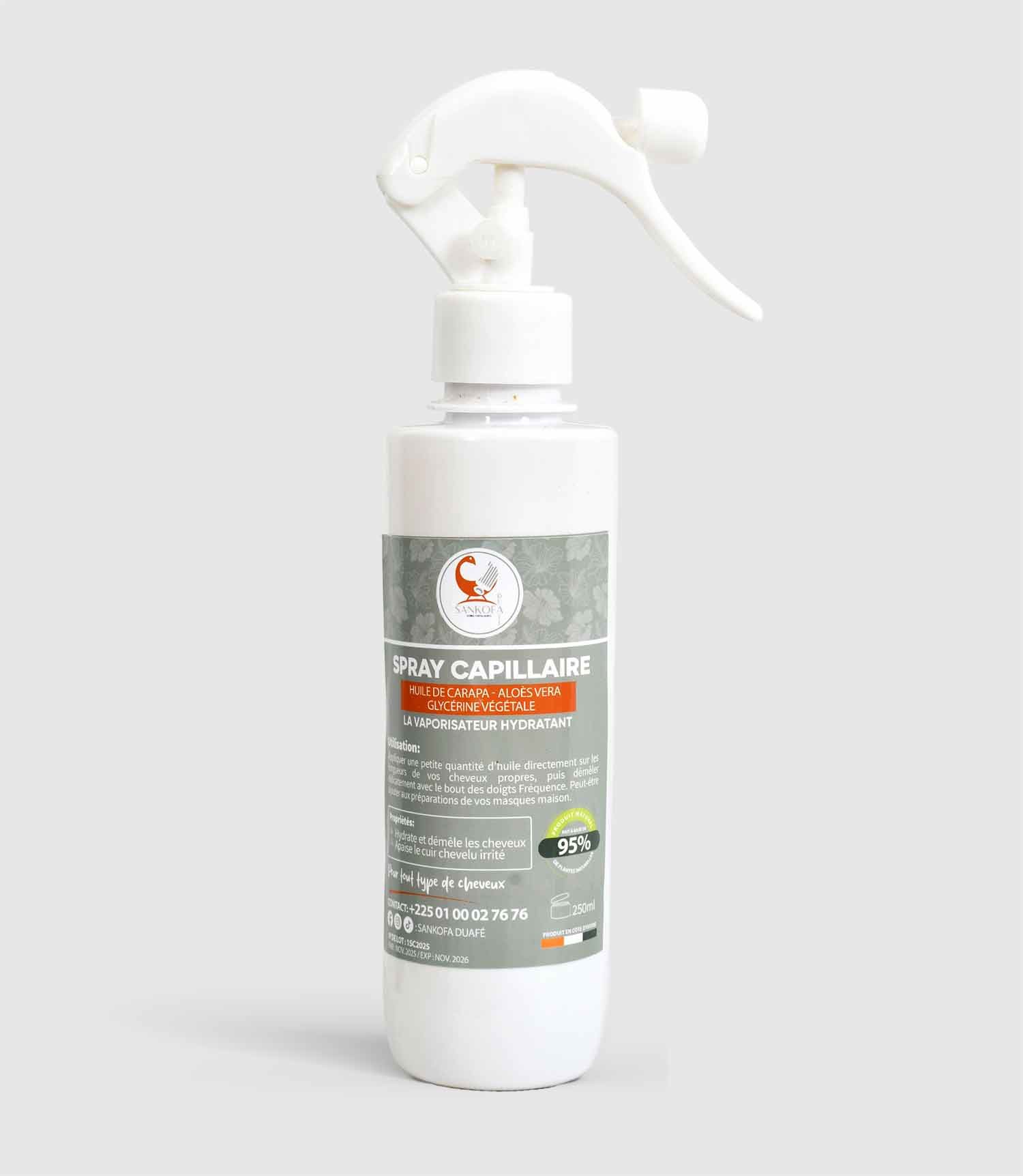.Propriétés : – Notre spray hydratant est un soin idéal à vaporiser sur les cheveux. Sa texture non grasse et légère est spécialement conçue pour une application quotidienne. Sa formule composée d’aloès, de glycérine et d’extrait de carapa hydrate et démêle les cheveux; apaise le cuir chevelu irrité et protège les cheveux des agressions extérieurs.